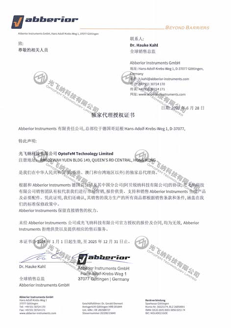 光飞纳科技有限公司是德国 Abberior 公司 的中国区(除香港、澳门和台湾地区以外) 独家代理商,专注于超分辨率成像技术;通过与Abberior 公司的紧密合作,为中国用户提供优秀的显微成像产品及实验解决方案。