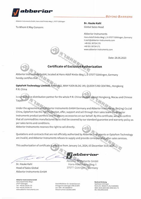 OptoFeM Technology Limited is the exclusive distributor of Abberior, who is very famous super resolution company in the world . we mainly focus on super-resolution imaging technology, and work closely with the inventor of STED and MINFLUX technologies, to provide cutting-edge imaging and microscopy products and experimental solutions with the best resolution performance for life science communities.